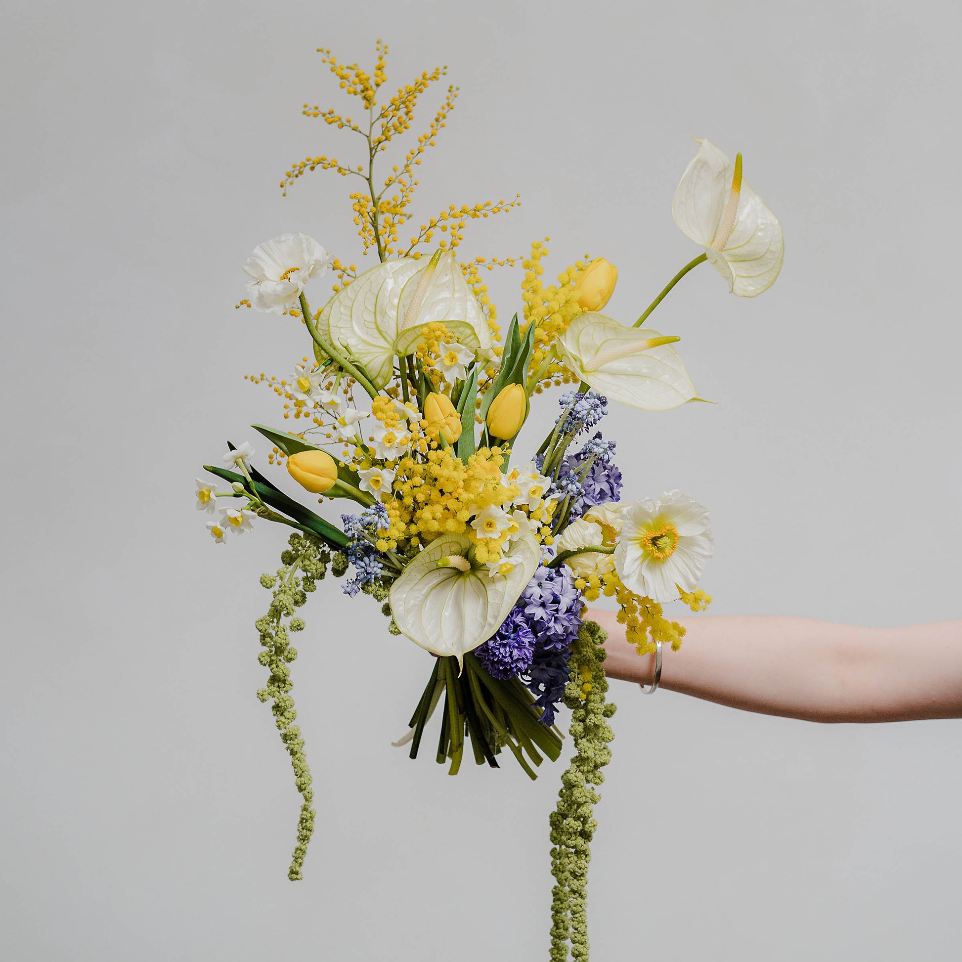 A special florals design brought to you by the team from Aspen Florals to celebrate International Women's Day & Mother's Day 2025. A true celebration of spring in vibrant yellow, ochre and Delph blue using French seasonal mimosa with scented spring bulb flowers and architectural terms offset the delicate petals of paper like papaver. A beautiful spring bouquet bursting with seasonal favourites and sweet scented spring blooms. This gorgeous floral design is our Mother’s Day special and includes blooms like ranunculus, tulips, lilacs, narcissi, hyacinth, mimosa, anthuriums and other seasonal blooms. Bold design and vibrant spring florals, with lush texture and sculptural shape this beautiful design is a celebration of the changing seasons using the best of what's available at this time of year as natures flowers slowly wake.